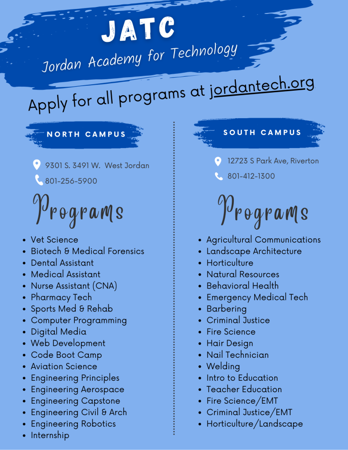 Junior and senior students can participate in career-focused programs offered at the Jordan Academy for Technology and Careers (JATC). Courses are taught in a two-period block, either morning or afternoon, and students are bused from the high school to either the North or South JATC campus.